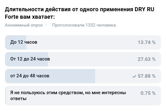В 2025 году брендом DRY RU был проведен опрос в официальной группе ВКонтакте. Это было сделано для выявления средне-статистического показателя длительности действия антиперспиранта DRY RU Forte.